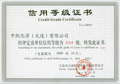 信用是一个公司立存于世的根本,也是公司发展壮大的基本保证,中凯化学经过2年的努力,公司在业务和管理上都在稳步提高,继2008年9月份获得ISO9001质量管理体系认证后,11月初中凯化学被大连市信誉评级委员会授予AAA级信用等级证书。这标志着中凯化学在日产经营中进入了一个新的阶段,中凯有信心、同时也让客户对中凯更加有信心———我们有能力做的更好。