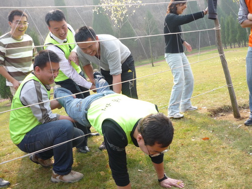 在拓展师的指导下,中凯员工分成两队进行较量。两队人马迅速建立了各队的队名、口号、队歌和队形并进行团队文化展示。一方是身着橙黄色队服的“海盗”队,海盗队队员们掀起勇者无敌、勇攀高峰的起义大杆,个个威风凛凛、膀大腰圆。一方是身穿绿色队服的“绿巨人”队,在以倡导绿色、环保、节能、创造健康新生活为主题的欢快气氛中,‘绿巨人们’个个精神抖擞、英姿飒爽。 |