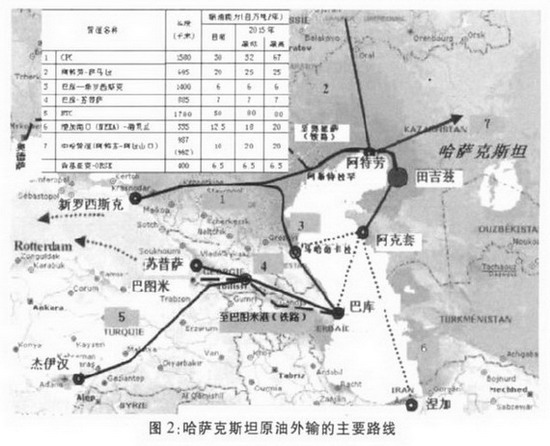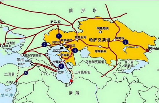 1,阿特劳—萨马拉输油管线 2,里海输油管线(哈萨克斯坦田吉兹—俄罗斯新罗西斯克港) 3,中哈原油管线(肯基亚克—库姆科尔—阿塔苏—阿拉山口) 4,哈属里海输油系统(叶斯科涅—库雷克—巴库—第比利斯—杰伊汉) 5,巴库—第比利斯—杰伊汉管线