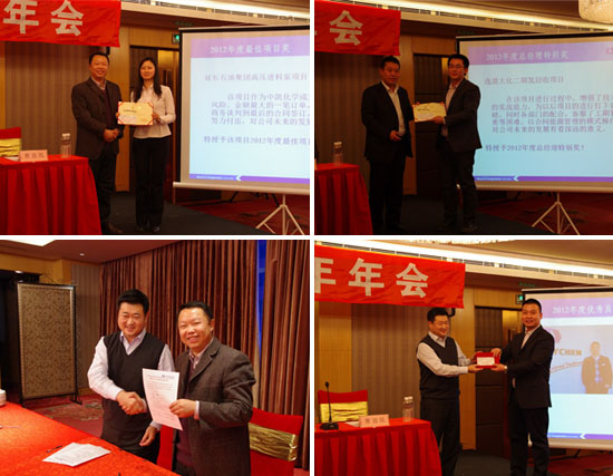 會(huì)議的結(jié)尾,對(duì)2012年評(píng)優(yōu)獲得者進(jìn)行表彰,其中,夏士剛獲得了“年度優(yōu)秀員工獎(jiǎng)”、<延長(zhǎng)石油集團(tuán)670萬(wàn)歐元高壓進(jìn)料泵項(xiàng)目>獲得了“年度最佳項(xiàng)目獎(jiǎng)”,<逸盛大化二期氫回收項(xiàng)目>獲得了“總經(jīng)理特別獎(jiǎng)”。