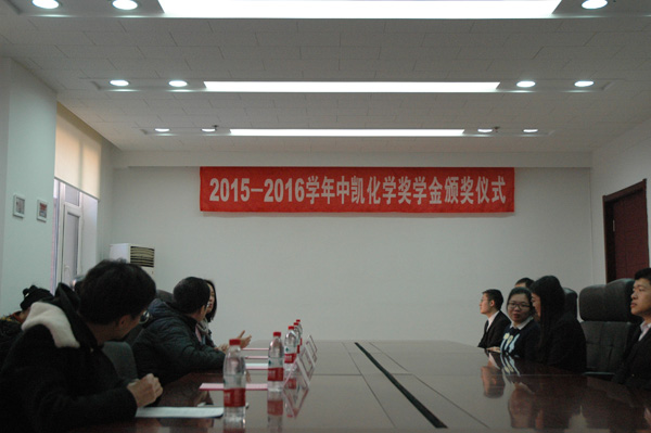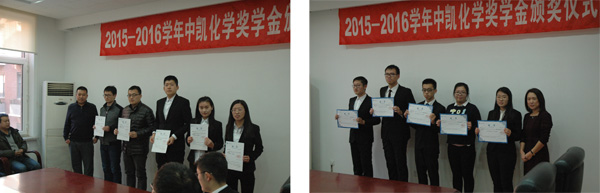 頒獎(jiǎng)儀式上,首先由化工與環(huán)境生命學(xué)部學(xué)生工作辦公室王一主任宣布“中凱化學(xué)獎(jiǎng)學(xué)金”獲獎(jiǎng)名單,并由中凱化學(xué)的領(lǐng)導(dǎo)為獲獎(jiǎng)的10名同學(xué)頒發(fā)榮譽(yù)證書。之后,獲獎(jiǎng)學(xué)生代表、化工學(xué)部研究生楊洋同學(xué)發(fā)言,向中凱化學(xué)表達(dá)了感謝之情,并分享了自己過(guò)去一年的成長(zhǎng)經(jīng)歷,同時(shí)表示會(huì)繼續(xù)努力,不辜負(fù)各方面的期望,將來(lái)為母校爭(zhēng)光。