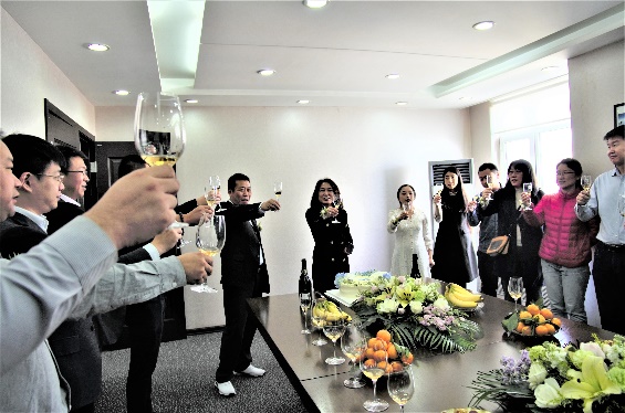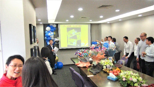 11:15分,最重要的環節來了,所有人挪步會議室,蛋糕、鮮花,果盤,擺滿了會議桌,大家齊唱生日歌,祝福公司15歲生日快樂!切蛋糕,開香檳,呂總深情致辭,回顧公司十五年的發展歷程,感動、感懷、感謝,同時也表達對公司未來發展的美好祝愿,大家感同身受,內心激動,所有的情感都化作一杯香檳酒,大家共同舉杯,為公司,為自己,干杯!