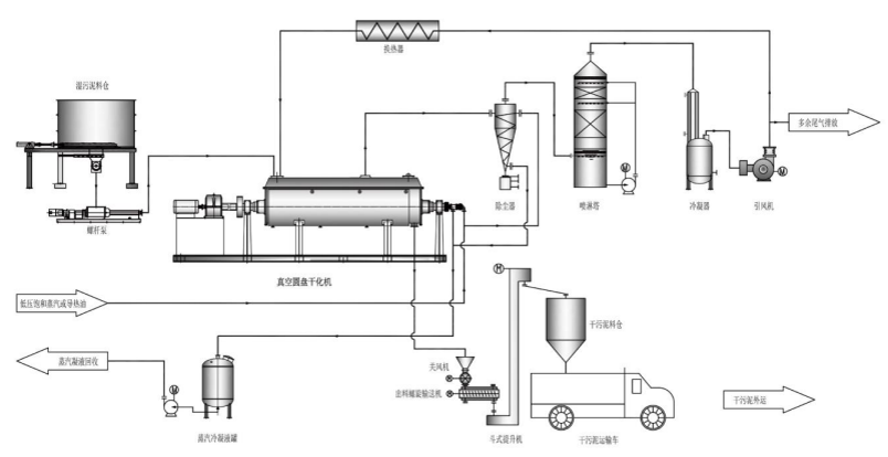 中凱化學(xué)所提供的真空圓盤干化系統(tǒng)集熱傳導(dǎo)干燥和攪拌輸送于一身,是一種新穎高效的節(jié)能型連續(xù)真空干燥設(shè)備。由密封進料、真空圓盤干化機、密封出料、尾氣處理等子系統(tǒng)組成密閉型間接換熱成套系統(tǒng),通過控可燃組分、控溫、控壓、控氧的方式實現(xiàn)了運行的安全控制,是目前國內(nèi)污泥干化工藝中安全性最高的系統(tǒng)之一。