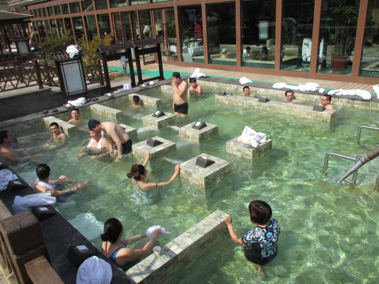 春意盎然,天高云淡,中凱抵達了大連著名的金石灘風景區金石唐風國際溫泉會館。唐風溫泉地處金石灘太陽溝,坐落于青山的懷抱中,建筑群體錯落有致,亭臺樓閣,小橋流水,紅燈翠柳,古樸怡然。與西安的華清宮不同,這里的溫泉與建筑布局親切,舒適,潔凈而又淡雅。誰不說溫泉也是一種文化呢?漫步在唐風靜謐怡人的小路上,涓涓水流,鶯鶯鳴唱,中凱人放松了、親切了。平時工作的緊張氛圍隨風淡去了。歡聲笑語搖身一變,化做空氣中歡快的細胞從噴頭中與溫泉水汩汩得涌動出來,灑落在年青中凱人健美的肌膚上。