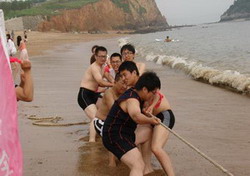 水上拔河游戲讓大家感受到不一樣的另類拔河,大家挽起褲管,踏著海浪在水中盡情的揮灑汗水。