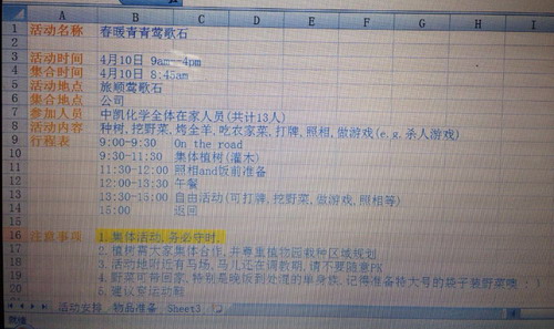 隨著中凱化學逐步進入正軌,公司領導層也越來越重視企業文化的建立和開展。我們迎來了公司成立后的第一次集體活動:春暖青青鶯歌石---踏青植樹烤全羊活動,我們在美麗的鶯歌石攜手種下了“中凱化學樹”,宛如慶祝一個新生命的誕生一樣,掛上了樹牌。我們的每一次活動都會有詳細的策劃哦。瀏覽歷史文檔的時候,很輕易的就找出了我當年起草的活動通知:
