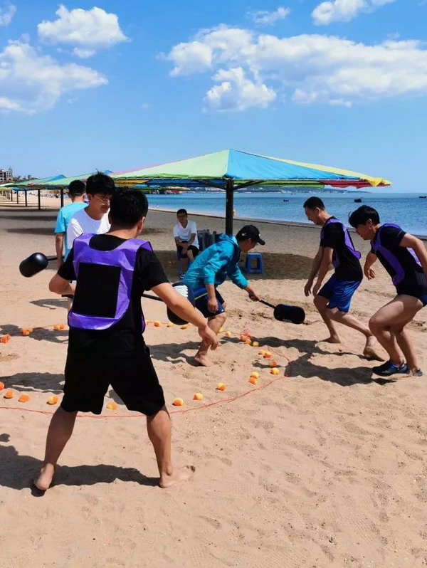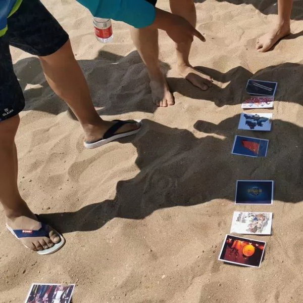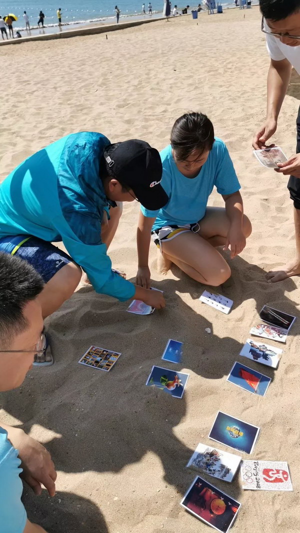 車程近一小時,伴著歡聲笑語,大巴車完成他的使命,頭也不回的走了。下了車的人兒,伸展著腰身,眺望著大海,有人便已迫不及待要擁抱大海了,簡單整頓一番,接下來準備拓展比賽了。