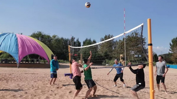 美餐過后,大家自由活動,燒烤小分隊給大家提供源源不斷的美食,沙灘排球此時也正打的火熱,炙熱的晌午太陽烤的人滋滋冒油,怕曬的三三兩兩坐在帳篷下閑談,微風徐徐,好不舒爽!