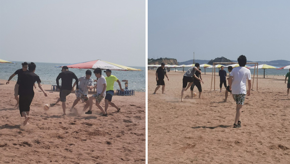 不遠處,沙灘上的“影子們”開始竄動起來,帶球、傳球、突破、射門,行云流水,活力滿分,上演一次次精彩的攻防戰。