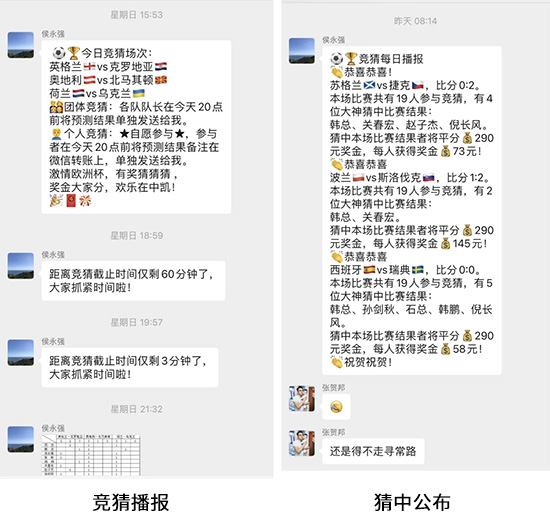 本屆歐洲杯開幕戰及后續幾場賽事,恰逢端午節小長假期間,兩支隊伍的隊長認真負責,積極組織隊員討論分析,大家踴躍參與,獻計獻策,隊長綜合隊員們的意見,確定本隊的預測結果。